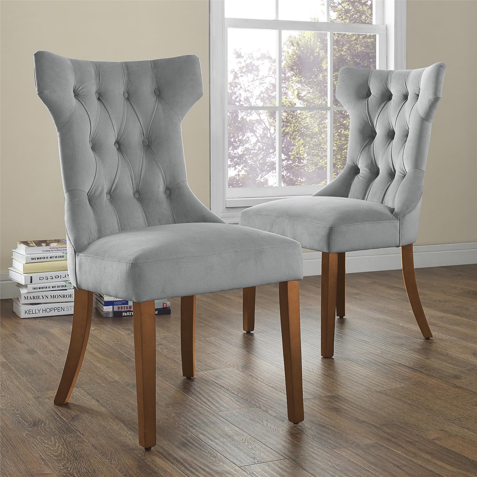 This 2-pack armless upholstered dining chair set features a classic tufted design, soft velvet fabric, and sturdy wood legs — perfect for adding sophistication and comfort to your dining room or any space