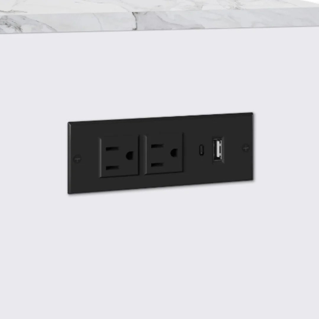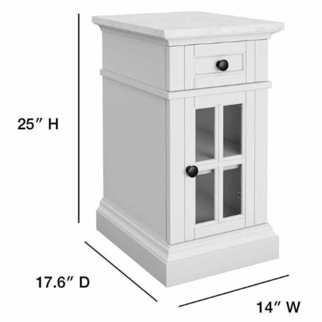 The Tresanti Kerrigan Chairside Table features a sleek white finish, marble top, and built-in power ports — blending elegance, storage, and device charging all in one compact design.