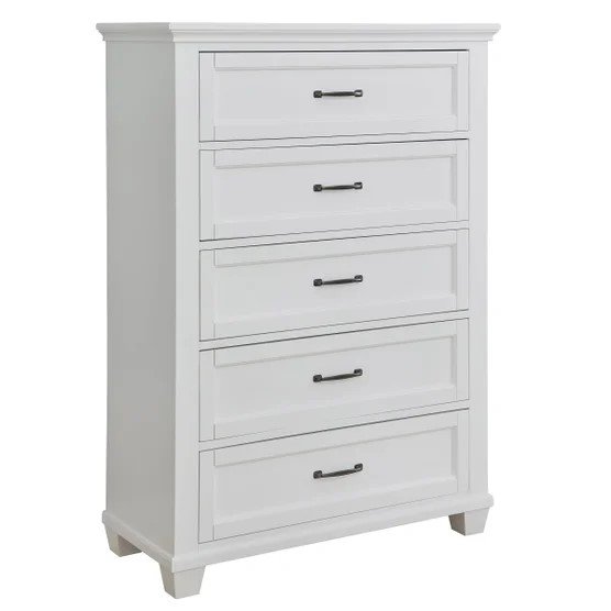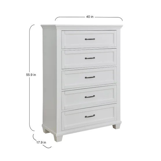 This 5-drawer chest blends clean lines, a bright finish, and smooth drawer glide — offering timeless design and spacious organization for any bedroom